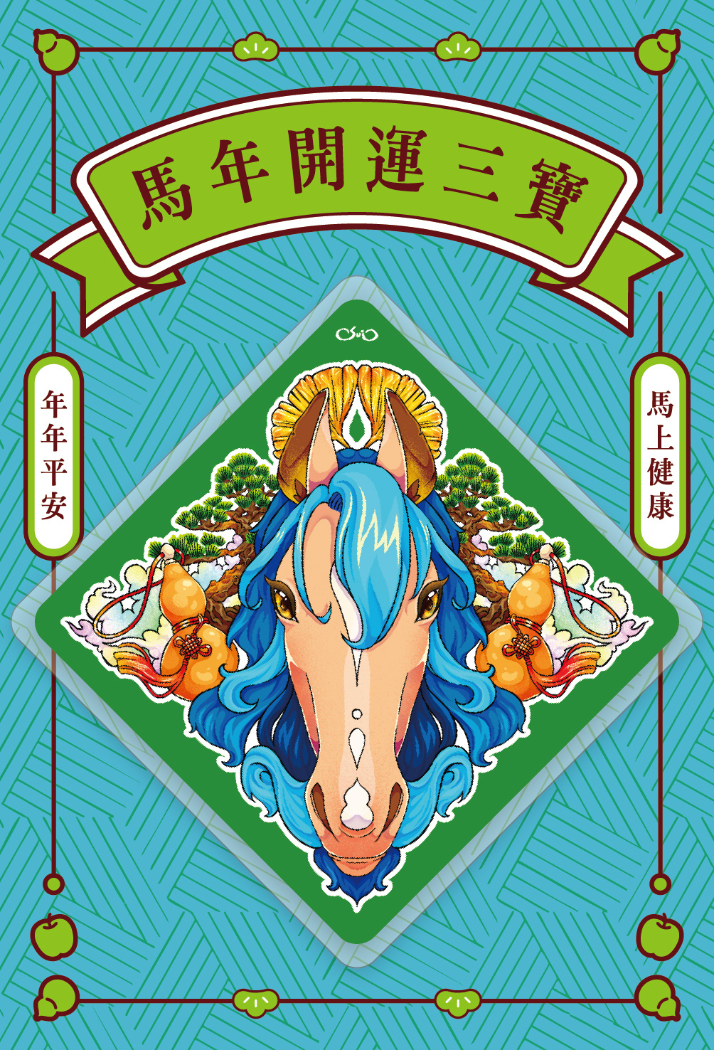 這款設計選用了沉穩寧靜的青藍色調,呼應大自然的療癒力量。馬背上馱著象徵「收納福氣」的金色葫蘆,背景則是代表長壽與堅毅的常青松樹。