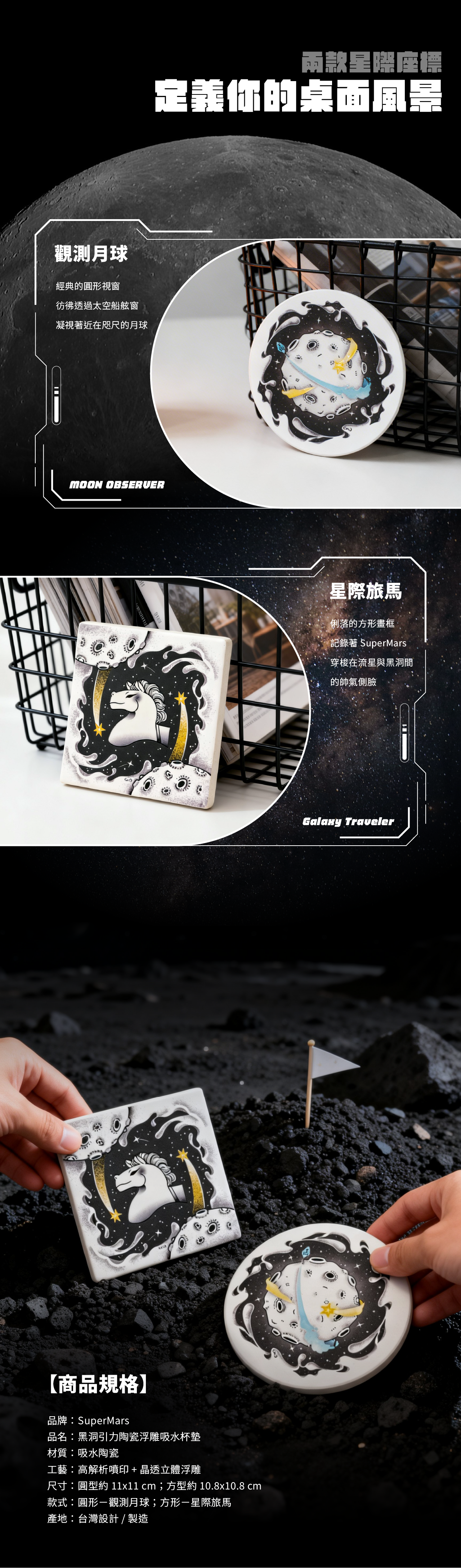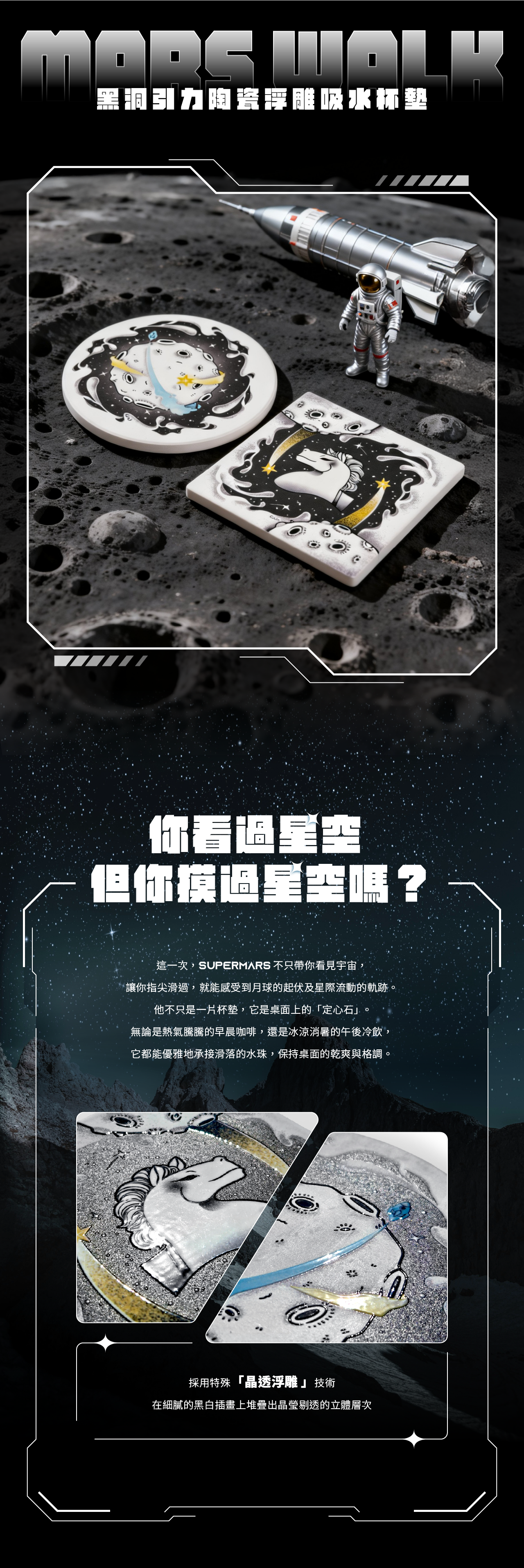 SuperMars 星際日常系列,以「宇宙觀測」為中心信仰,引用德國哲學家康德(Immanuel Kant)的傳世名言—— “Two things awe me most, the starry sky above me and the moral law within me.” (唯有二事能讓內心深受震撼:頭頂浩瀚的星空,與心中的道德法則),透過純粹的黑白筆觸與晶透立體浮雕,書寫出 SuperMars 對於未知領域的探索理念;質感兼具實用性高的品項,陪伴每一位城市漫遊者,在沉澱思緒、品飲喘息的每一時刻。